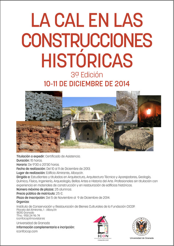 Partiendo de esta premisa, el objetivo primordial de este curso es el análisis y conocimiento del proceso de fabricación, de las funciones y de las propiedades físico-químicas de la cal, a partir de los principios, de las técnicas y de los ensayos más resolutivos y actuales de Ciencias de los Materiales, para su posible aplicación en el Patrimonio Histórico Artístico.