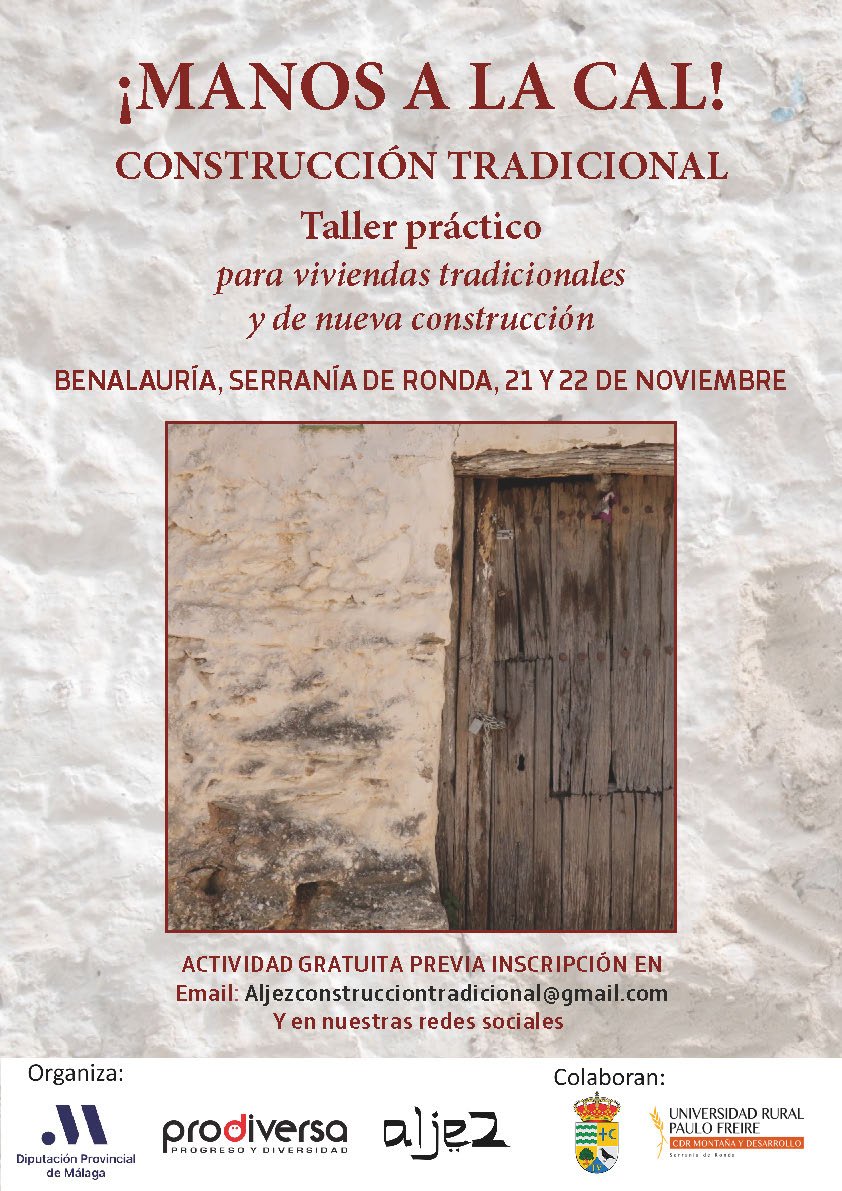 Los días 21 y 22 de noviembre la localidad de Benalauría, en la Serranía de Ronda, acogerá el taller práctico “¡Manos a la cal!”, una actividad gratuita dedicada a la recuperación de los saberes tradicionales de la construcción con materiales naturales.